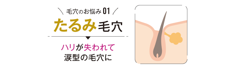 毛穴のお悩み 01 【 たるみ毛穴 】 → ハリが失われ、涙型の毛穴に 加齢や紫外線、乾燥などの影響で、真皮のコラーゲンやエラスチンなどの弾力線維が減少したり、破壊されることで現れます。ハリや弾力が失われ、皮膚が垂れ下がることで毛穴の形が変形し、涙型の毛穴になってしまいます。 |