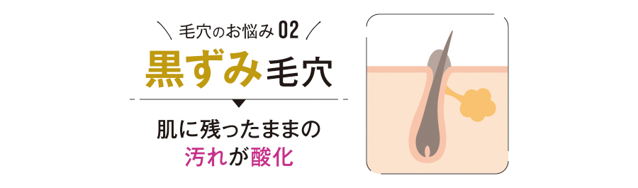 毛穴のお悩み 02 【 黒ずみ毛穴 】 → 肌に残ったままの汚れが酸化 過剰に分泌された皮脂が雑菌や古い角質と混ざり、毛穴に詰まって酸化することで黒ずんで見えます。鼻や額は他の部位より皮脂量が多いため、黒ずみが起こりやすくなり、間違ったケアをすると悪化する場合もあります。 |